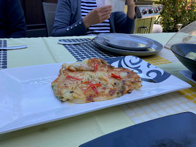 We drove tp Redwood City and spent the afternoon at Patrick and Soren's house. They made a delicious lunch for us that included these flat onion pancakes that were so tasty. It was a bit windy but warm enough. Patrick and I played four games of cribbage. All good.